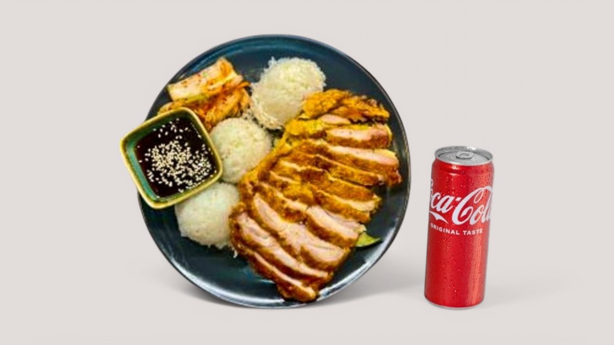 Kuracie stehno nakrájané na plátky, pripravené na chrumkavý spôsob, yelenina, teriyaki omáčka ( 250g), príloha na výber + nápoj