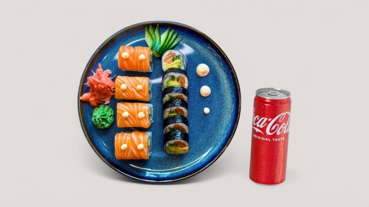 Futumaki 6ks: (Avokádo, uhorka, losos, syr Philadelphia) Uramaki 8ks: (dvojitý losos, avokádo, syr Philadelphia) Japonská majonéza + nápoj