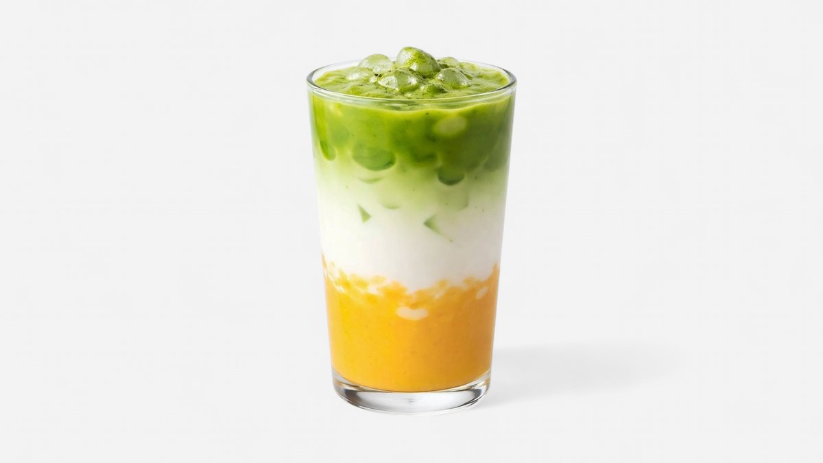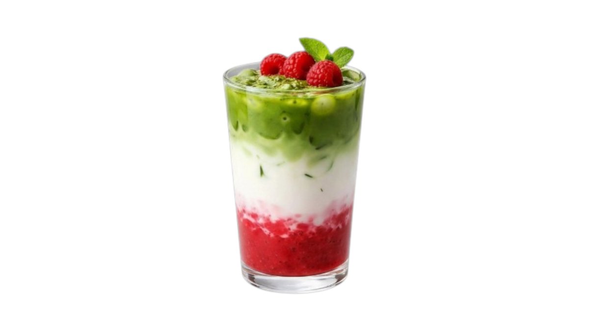 MAtcha na ľade s malinovým pyré a kokosovým mliekom
