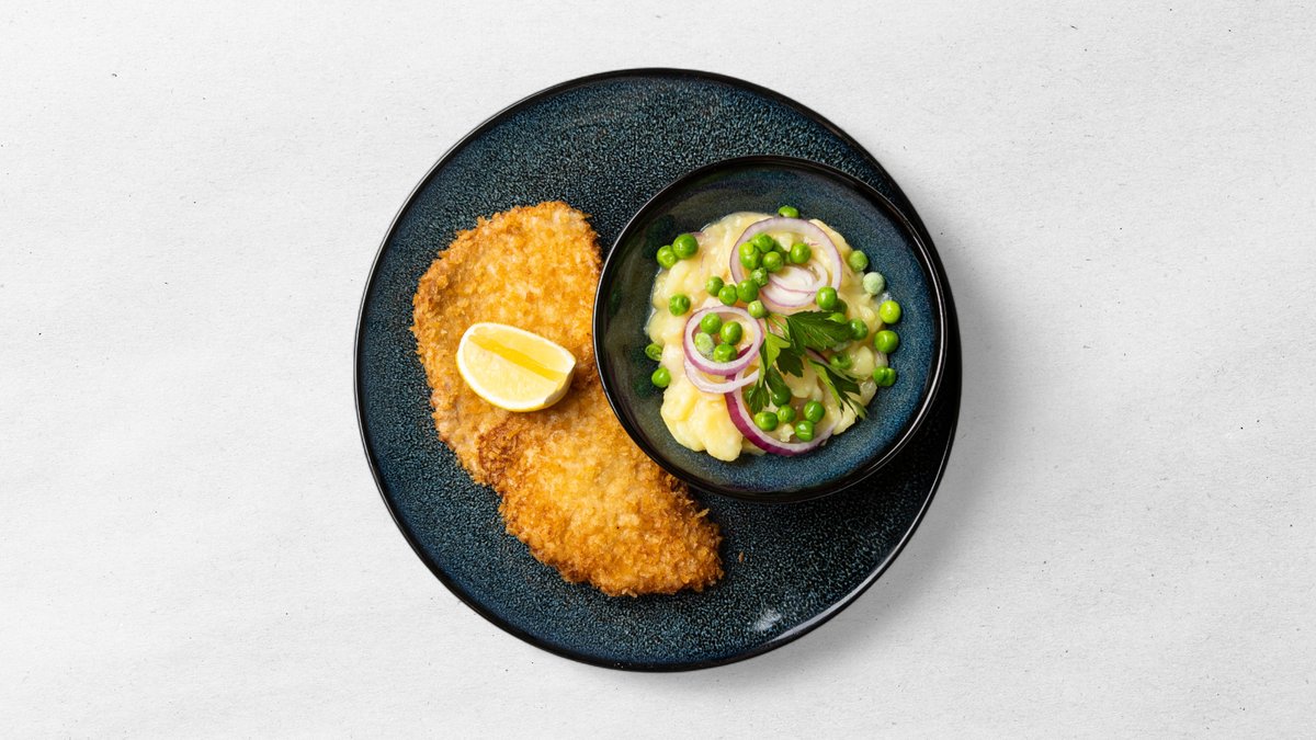 160g Teľací rezeň, tradičný zemiakový kyslý šalát