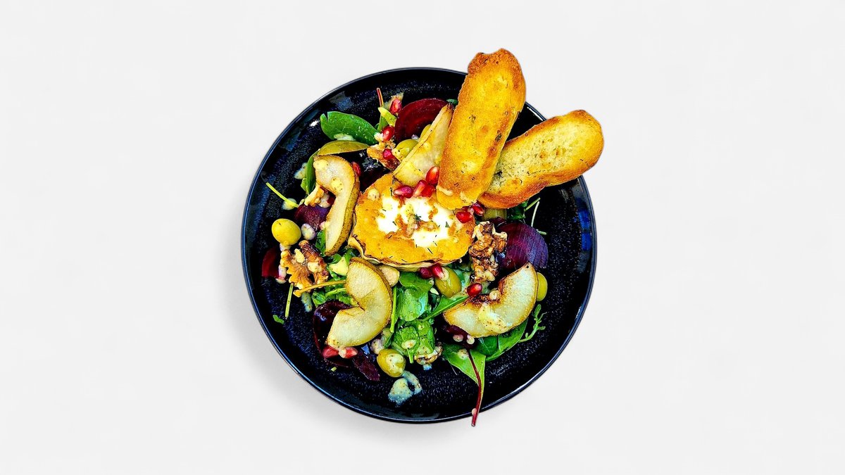 200 g / 70 g Šalát z pečenej zeleniny, grilovaný kozí syr, cviklový džem (7) + polievka (v cene)