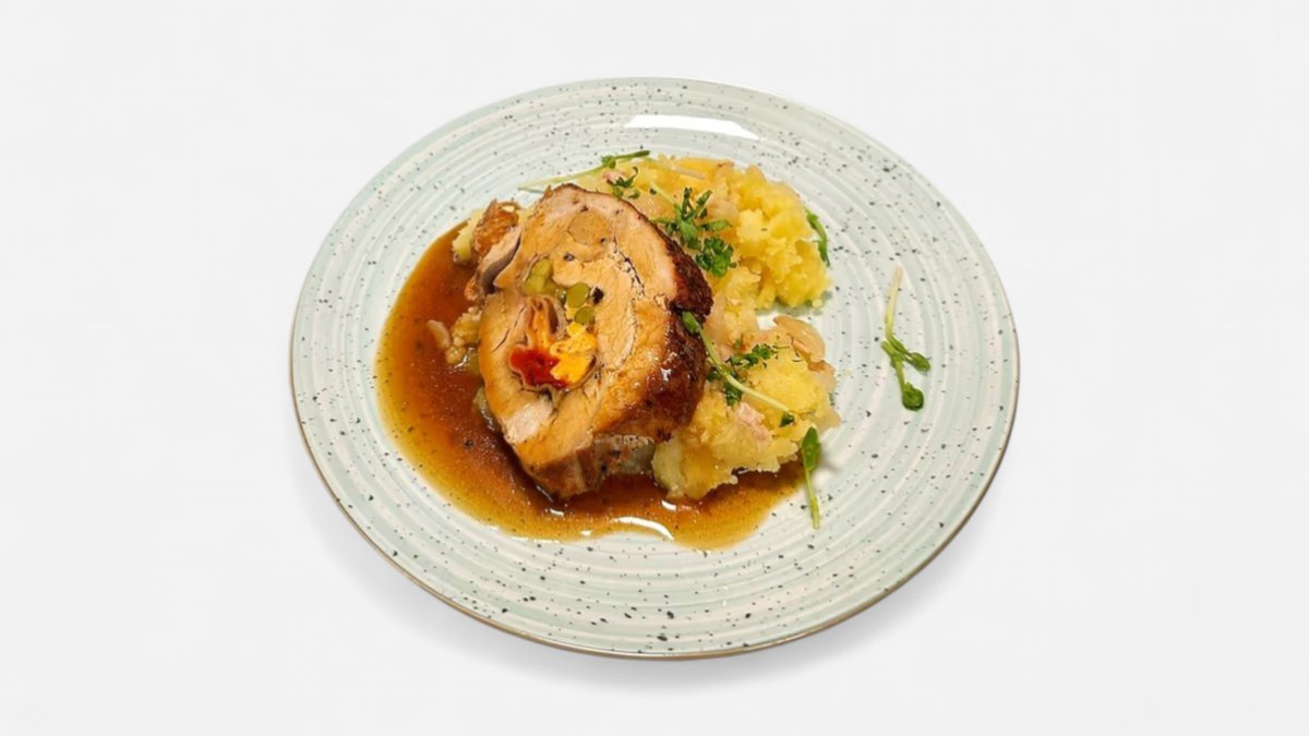 8,90 €1. 300g Bravčová roláda s praženicou, pučené zemiaky s cibuľou, prírodná omáčka A:1,3,10