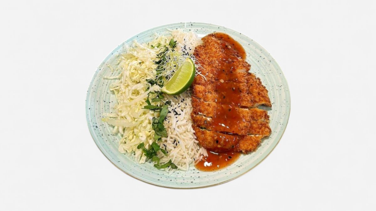 8,90 €5. 300g Kurací tonkatsu, ryža, sladkokyslá omáčka, kapustový šalát A: 1,3,7,11