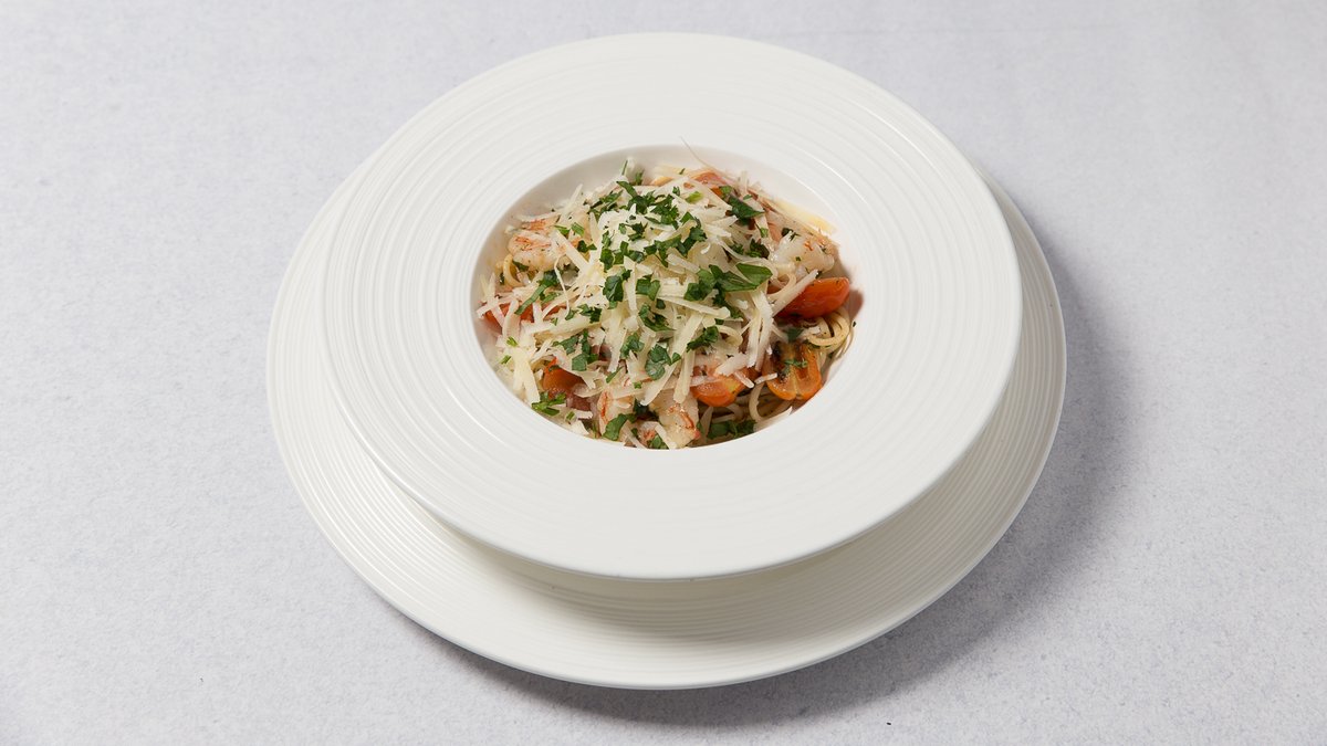 Špagety aglio olio e peperoncino s grilovanými krevetami a cherry paradajkami