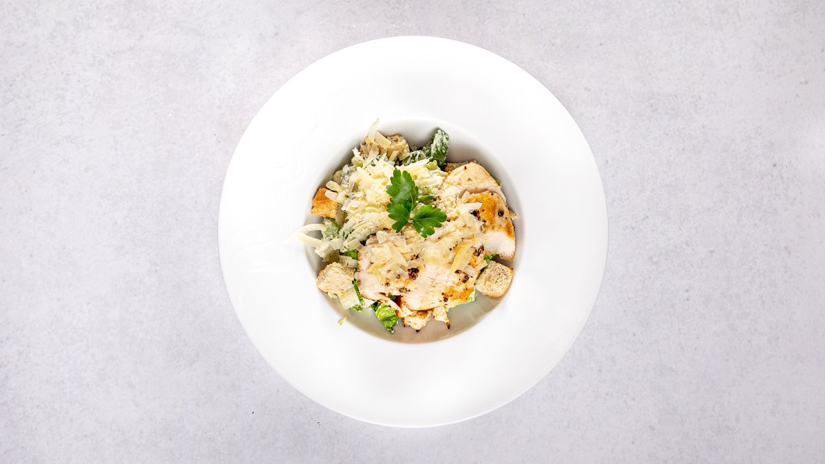 rímsky šalát, grilované kuracie mäso, opečená slanina, parmezán, dressing, toast 320g / obsahuje: 1,4,7