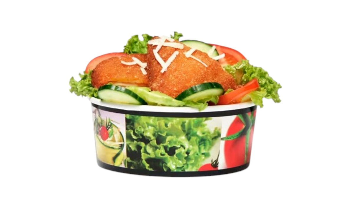 300g ladový šalát, paradajka, uhorka, vyprážaný nakrájaný kurací plátok, dressing