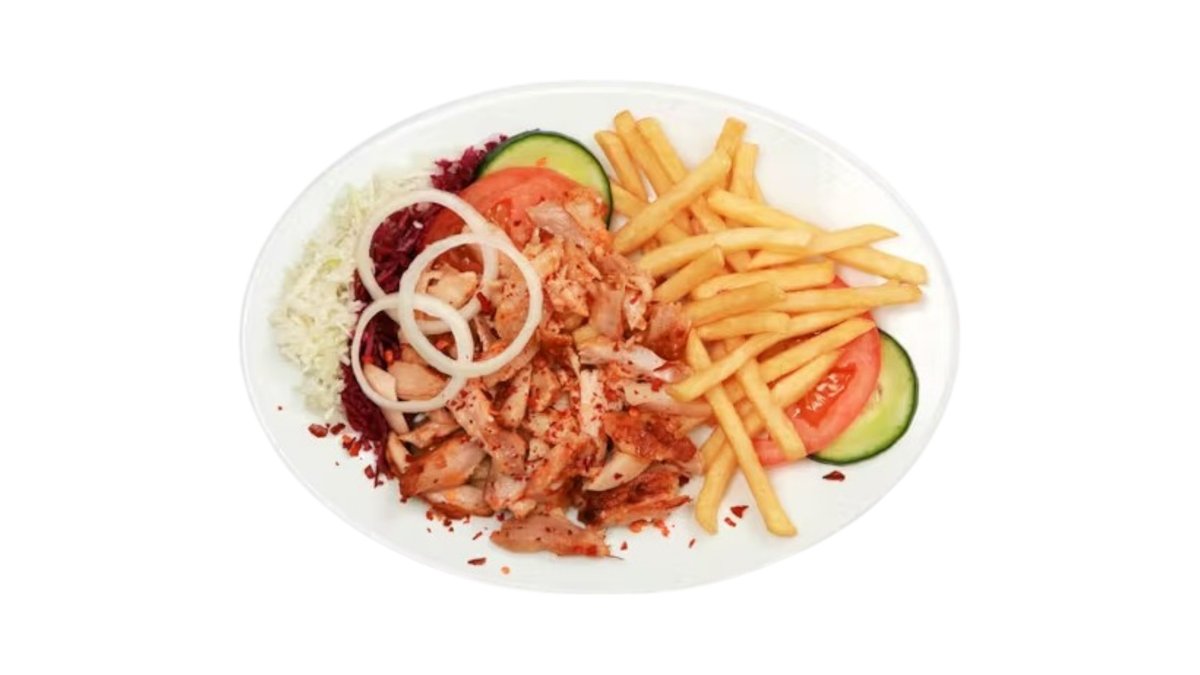 300g hranolky, kebab mäso, uhorky, paradajky, cibula, kapusta, dressing