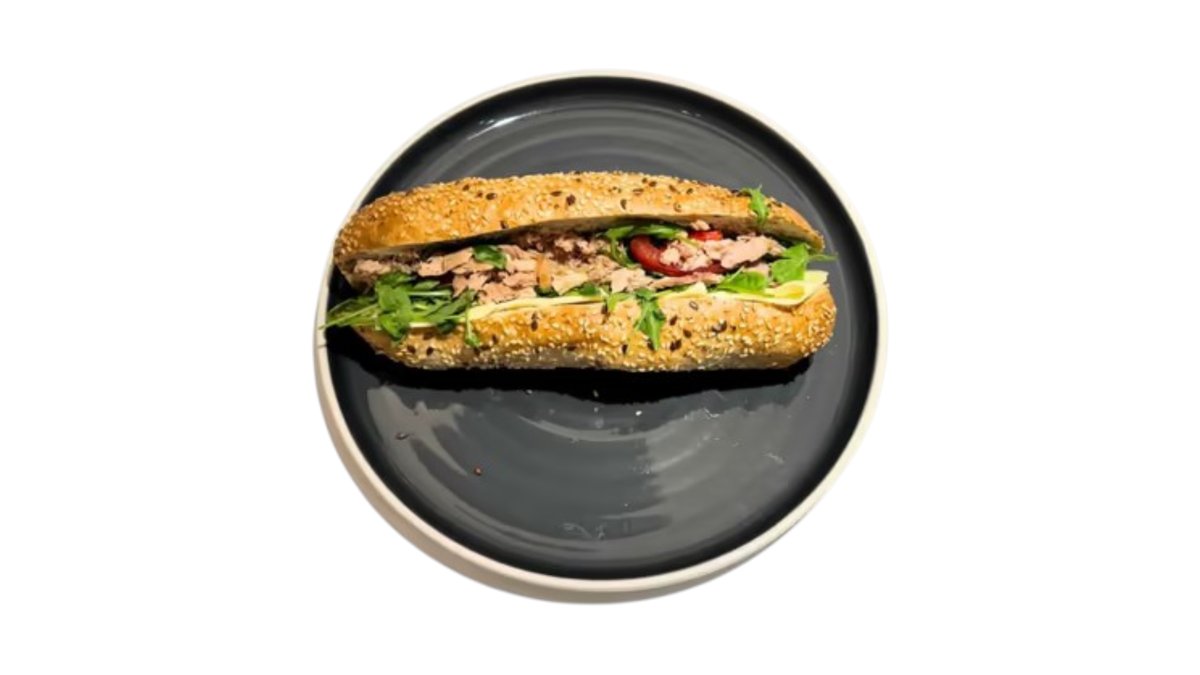 Čerstvá bageta od pekára, tatársky dresing, tuniak, syr, zelenina