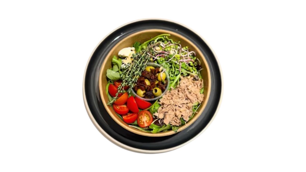Šalát, tuniak, olivy so sušenou paradajkou, cherry, píniovými orieškami