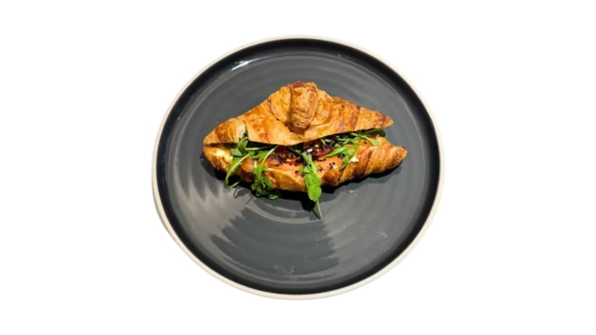 Croissant plnený avokádovo vajíčkovou nátierkou s lososom a rukolou , čiernym sezanom a cherry paradajkami