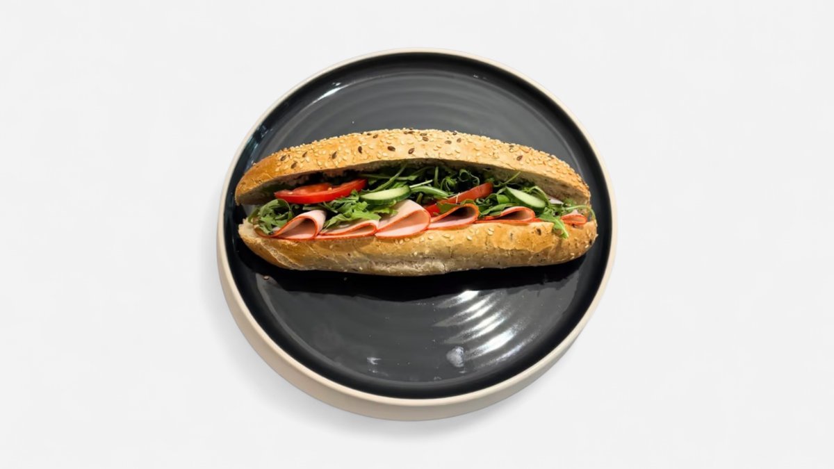 Čerstvá bageta od pekára, americký dresing, debrecínska šunka, zelenina