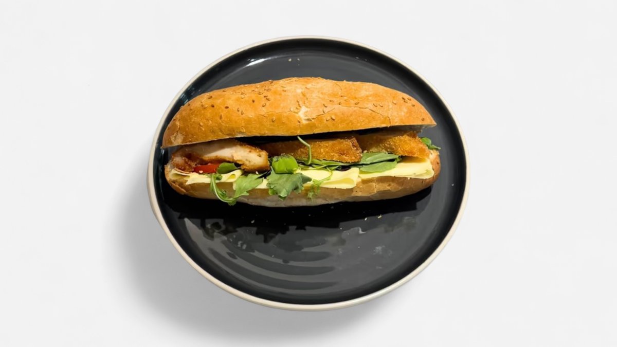 Čerstvá bageta od pekára, tatársky dresing, šunka, syr, zelenina