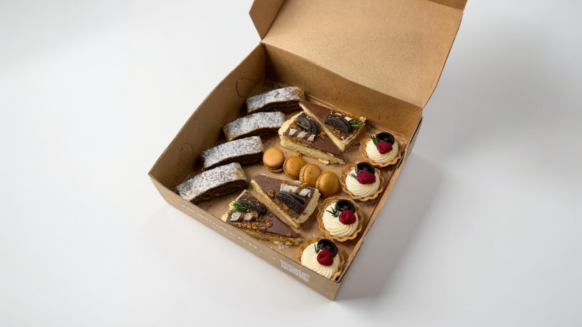 4 x štrudla, 4 x cheesecake ganache, 4 x makronka, 4 x tartaletka mascarpone