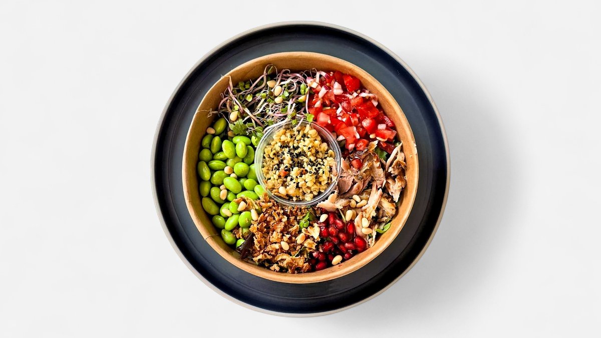Šalát, trhané mäso, kuskus, granátové jabĺčko, zelenina, a teryiaki dressing