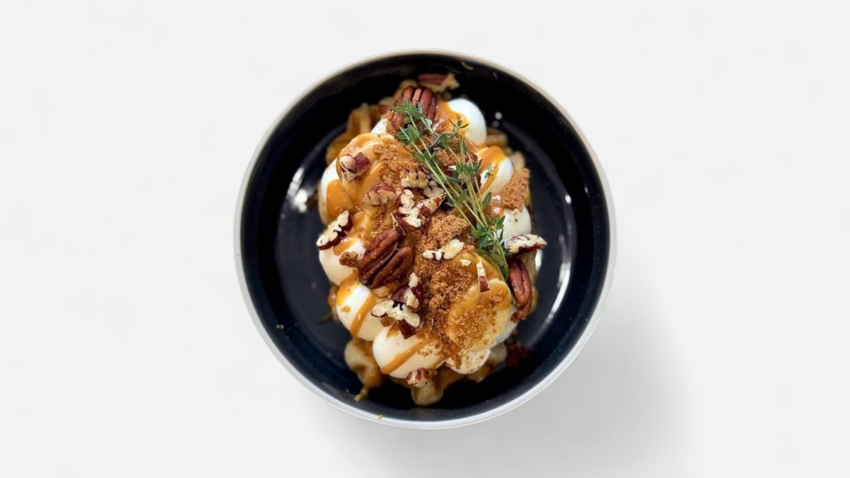 Wafla s tvarohovým krémom Karamelová ganache Pékanové orechy , Banán
