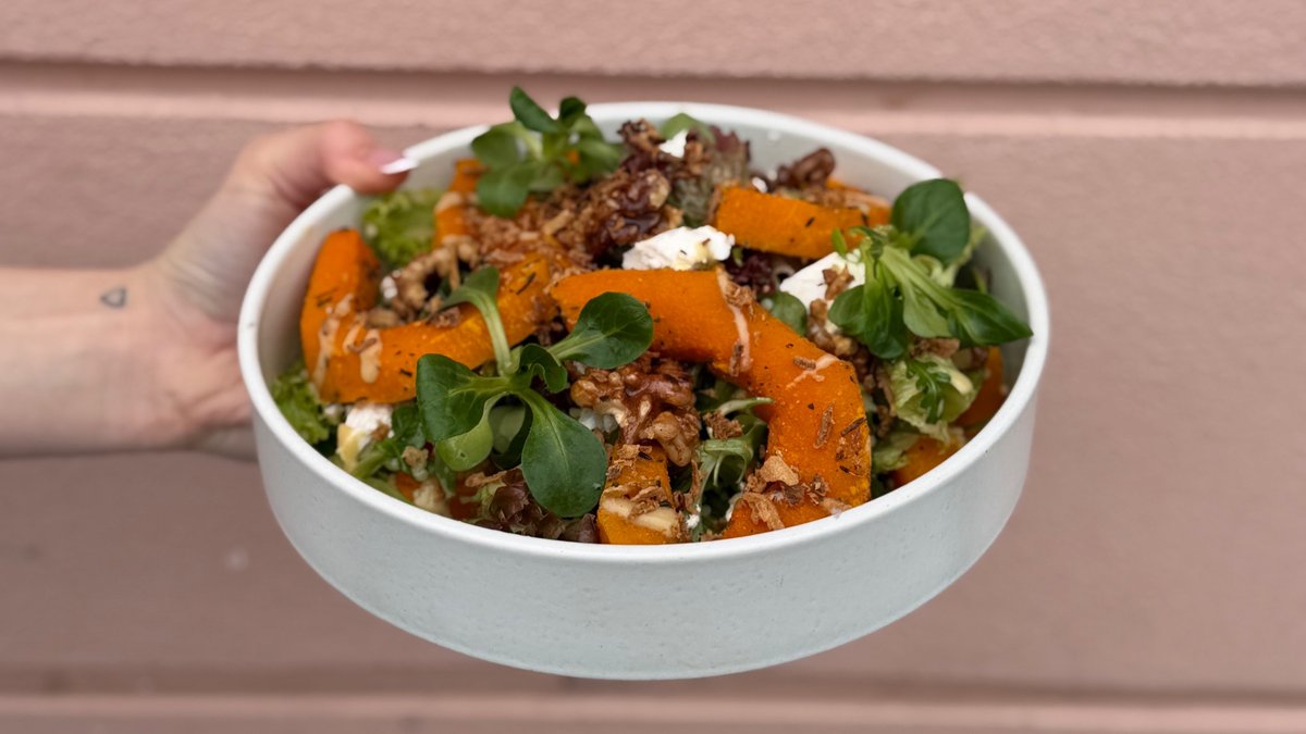 (350g) miešaný šalát, pečená tekvica, grécky syr, brusnicový cous cous, vinaigrette zo zeleného čaju, chilli medové orechy, Alegény: 1, 3, 7, 8, 9, 10