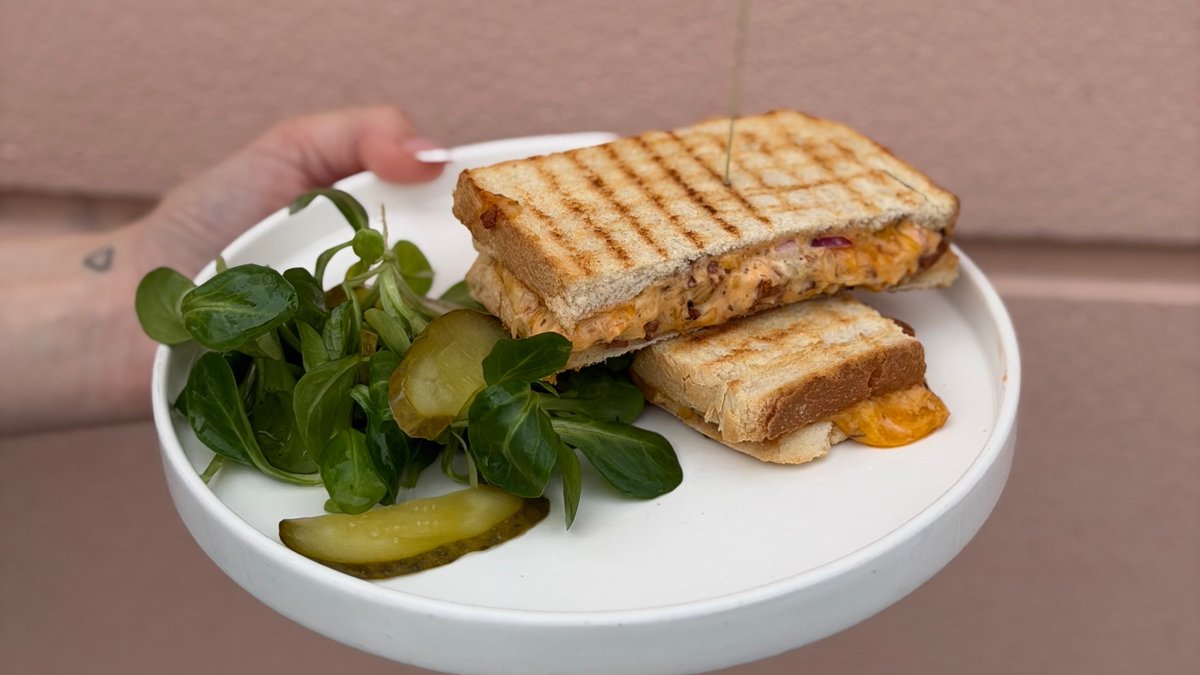 (300g) toast, slanina, cheddar, vajíčko 2x, chilli majonéza, šalátik, Alergény: 1, 3, 7, 8