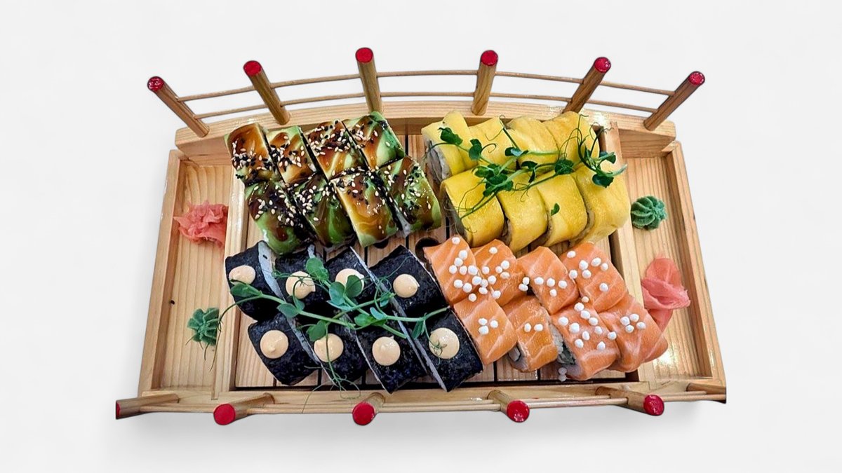 Tomago roll 8x (ryža, philadelphia syr, uhorka, krabia tyčinka, japonská omeleta tamago, spice omáčka), Ovara roll 8x (ryža, losos, uhorka, červený kaviár, japonská majonéza, sezam mix), Midory roll 8x (ryža, losos, uhorka, philadelphia syr, zelený kaviár), California classic 8x (ryža, avokádo, krabia tyčinka, uhorka, japonská majonéza, červený kaviár), Green Dragon 8x (ryža, uhor, japonská omeleta, uhorka, majonéza, avokádo, unagi omáčka s bielym sezamom), Philadelphia classic 8x (ryža, uhorka, philadelphia syr, losos) 48 ks / obsahuje: 2,3,4,6,7,11