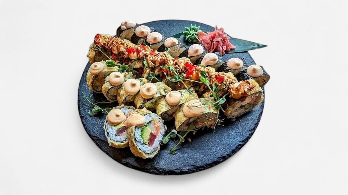 Rolka plnená: ryža, tempurované krevety, pažítka, tuniak, klíčky, mango, avokádo, rolka preliata omáčkou TOBIKO (majonéza, sójová omáčka a červený kaviár) obsahuje: 2,3,4,6