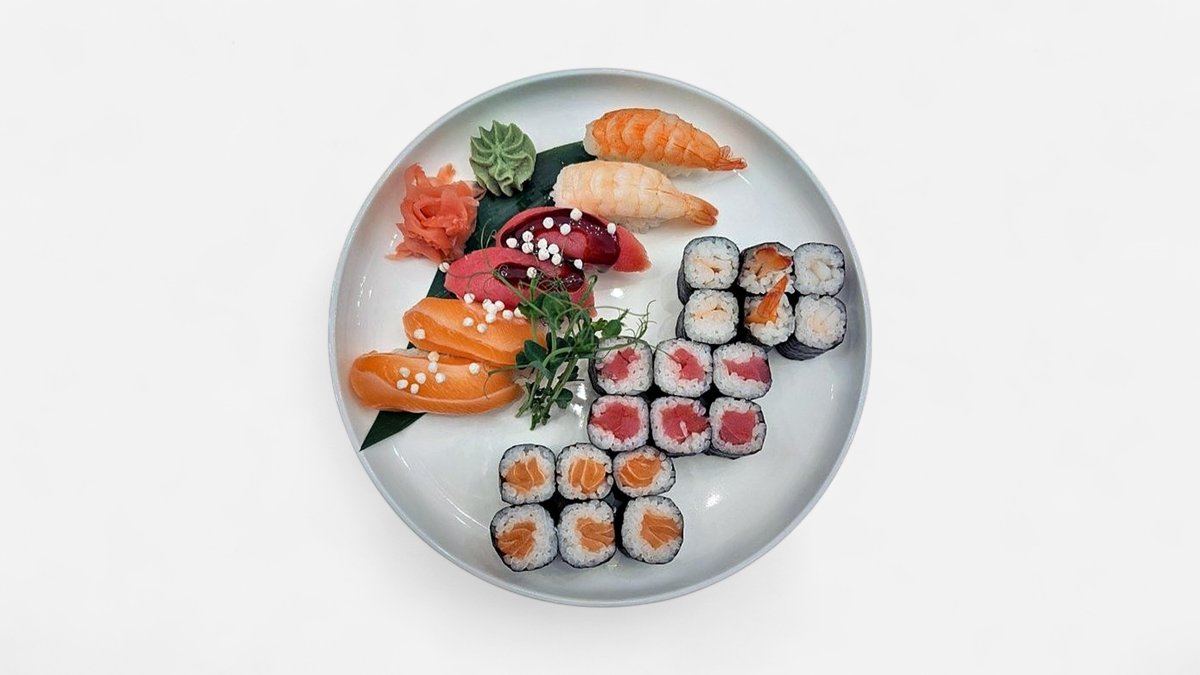 Maki losos 6x, maki tuniak 6x, maki kreveta 6x, nigiri losos 2x, nigiri tuniak 2x, tuniak 2x. 24 ks / obsahuje: 2,4