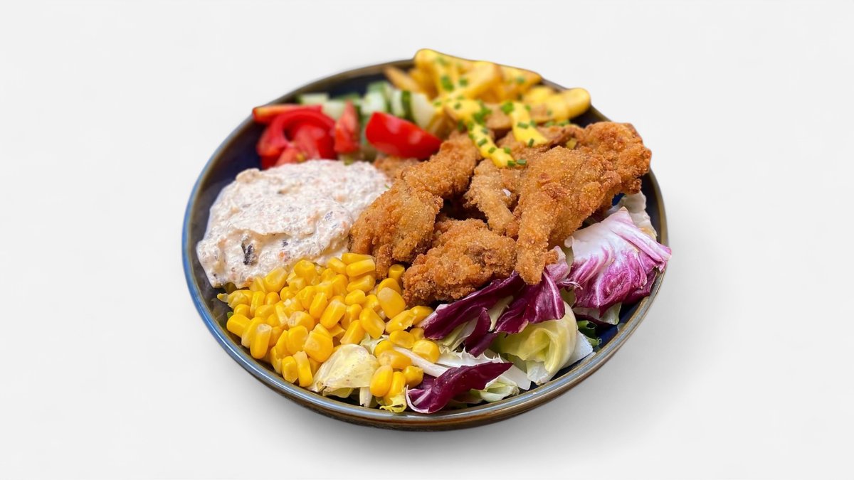 obaľovaná chrumkavá hliva v trojobale, zemiakové hranolky, domáca vegan cheddar omáčka a treska, čerstvá zelenina