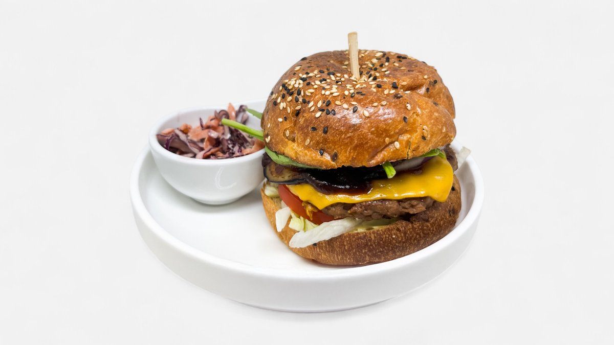 grilovaná kvásková žemľa, čerstvý šalát, beyond meat placka, grilovaný baklažán s BBQ omáčkou, vegan cheddar, paradajka, červená cibuľa, nakladaná uhorka, baby špenát, domáci lahôdkový "cheese" dip