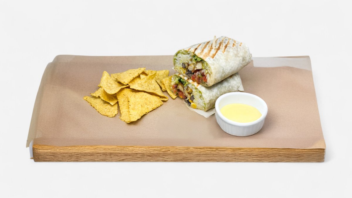tortilla, guacamole, ľadový šalát, ryža, čierna fazuľa, kukurica, pico de gallo, marinované grilované vegan "kuracie", baby špenát, lahôdkový "cheese" dip