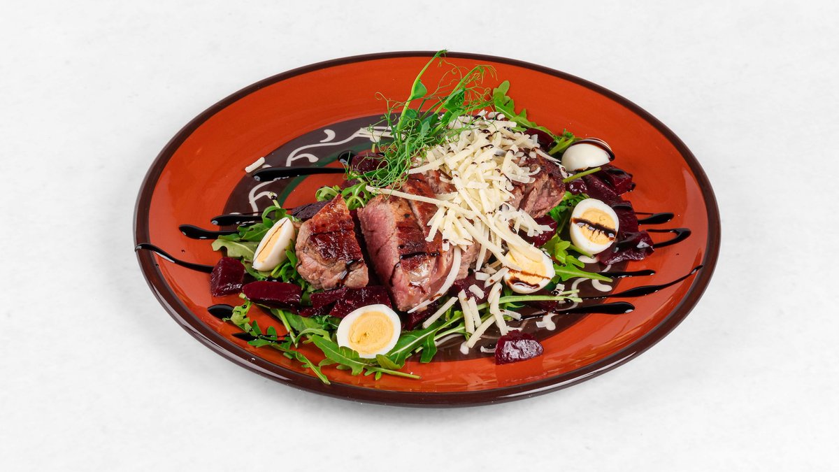 Solata z roast beefom, popečeno rdečo peso, jajcem, parmezanom in balzamičnim prelivom