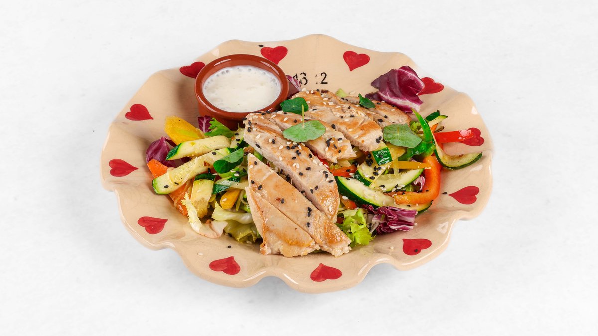 Solata s piščancem, pečeno zelenjavo, sezamom in jogurtovim prelivom
