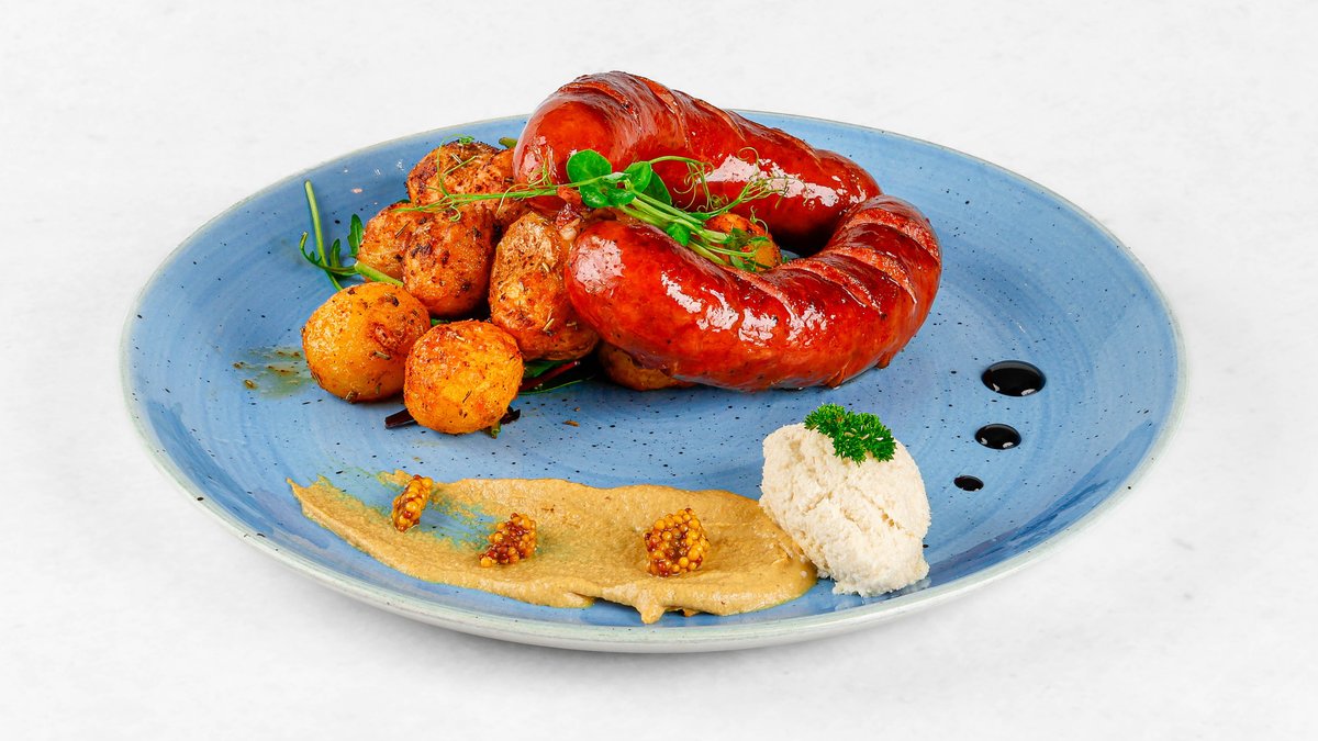 Kranjska klobasa (kuhana ali na žaru) s pečenim krompirjem