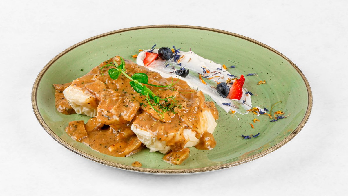 Domači sirovi štruklji z gorenjsko skuto ter omako z jurčki