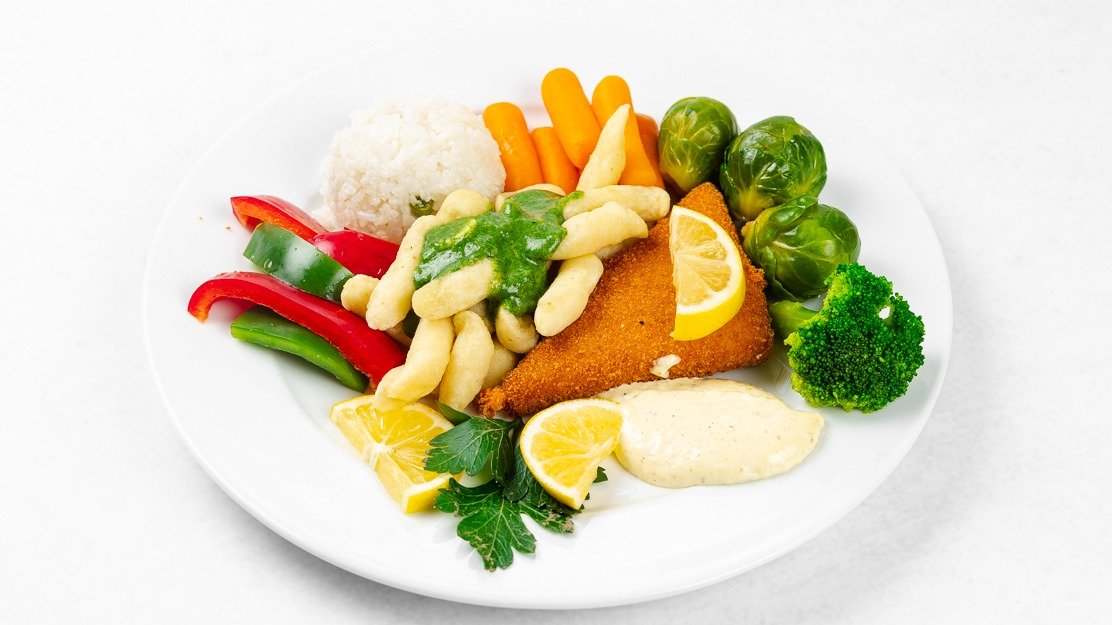 Ocvrt piščanec, dunajski zrezki, svinjska rebrca, krompirček, riž, pečen krompir, pražen krompir, zelenjava V ceno jedi je všteto doplačilo 0.50 eur za biorazgradljivo embalažo