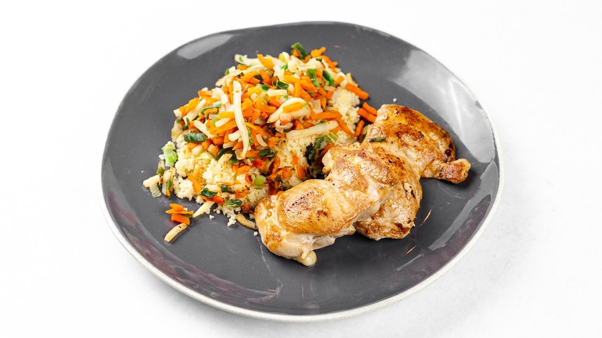 2x piščančje stegno, popečena zelenjava, kuskus V ceno jedi je všteto doplačilo 0.50 eur za biorazgradljivo embalažo