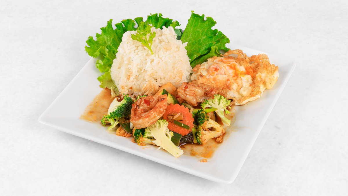 Riž, škampi, korenje, zelje, brokoli, cvetača, bučke, por, jajce, ostrigina omaka, sojina omaka V ceno jedi je všteto doplačilo 0.50 eur za biorazgradljivo embalažo