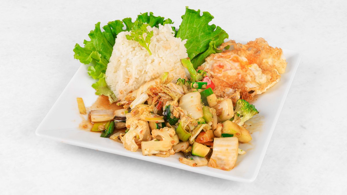 Riž, tom yum pasta, brokoli, cvetača, bučke, jajce, ktajsko zelje, korenje, por, ostrigina omaka, sojina omaka V ceno jedi je všteto doplačilo 0.50 eur za biorazgradljivo embalažo