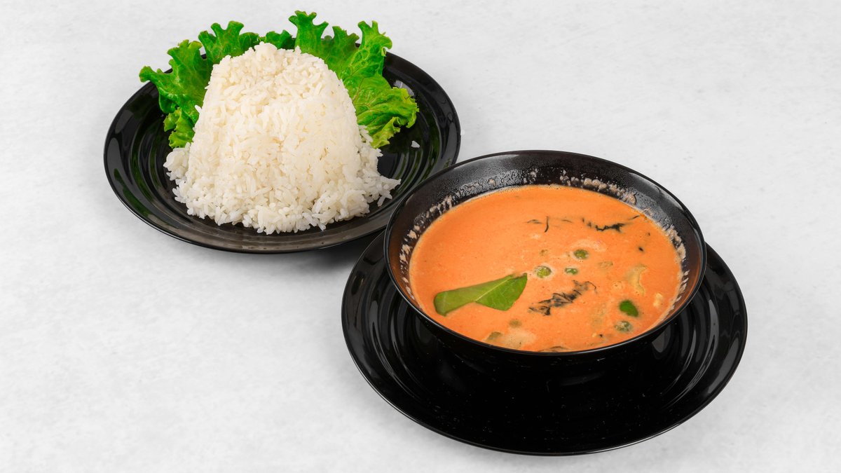 Riž, kari pasta, kokosovo mleko,tajski malancani, bambus, palmin sladkor V ceno jedi je všteto doplačilo 0.50 eur za biorazgradljivo embalažo