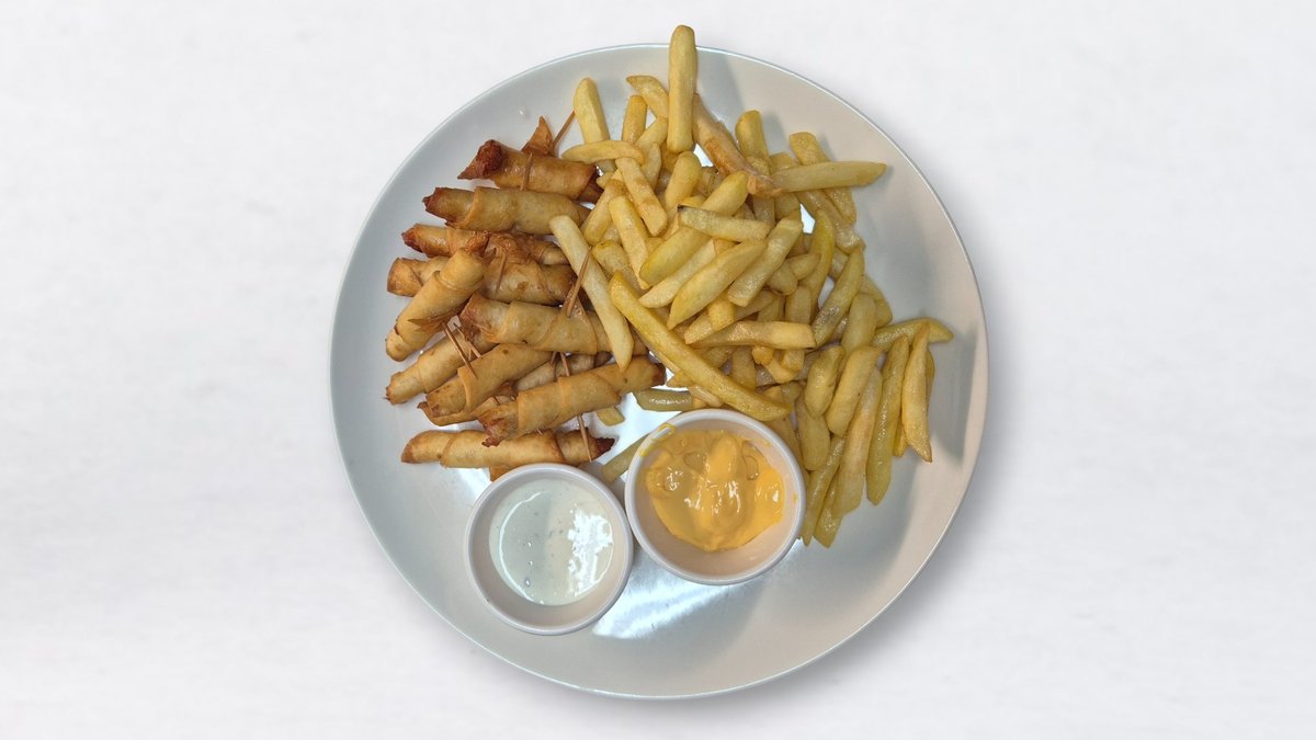 Piščančji zvitki (10 kom) s pomfrijem, nacho in jogurtova omaka