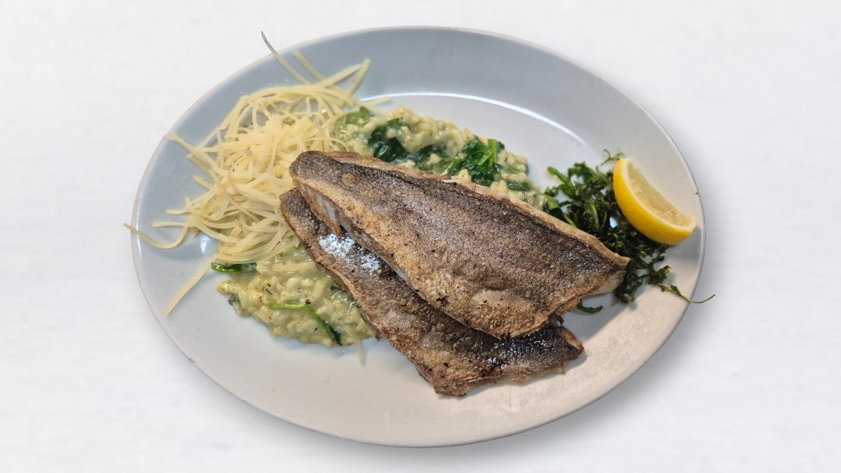 Ribji krožnik: File brancina z ocvrto hobotnico, pečen krompir in zelenjava