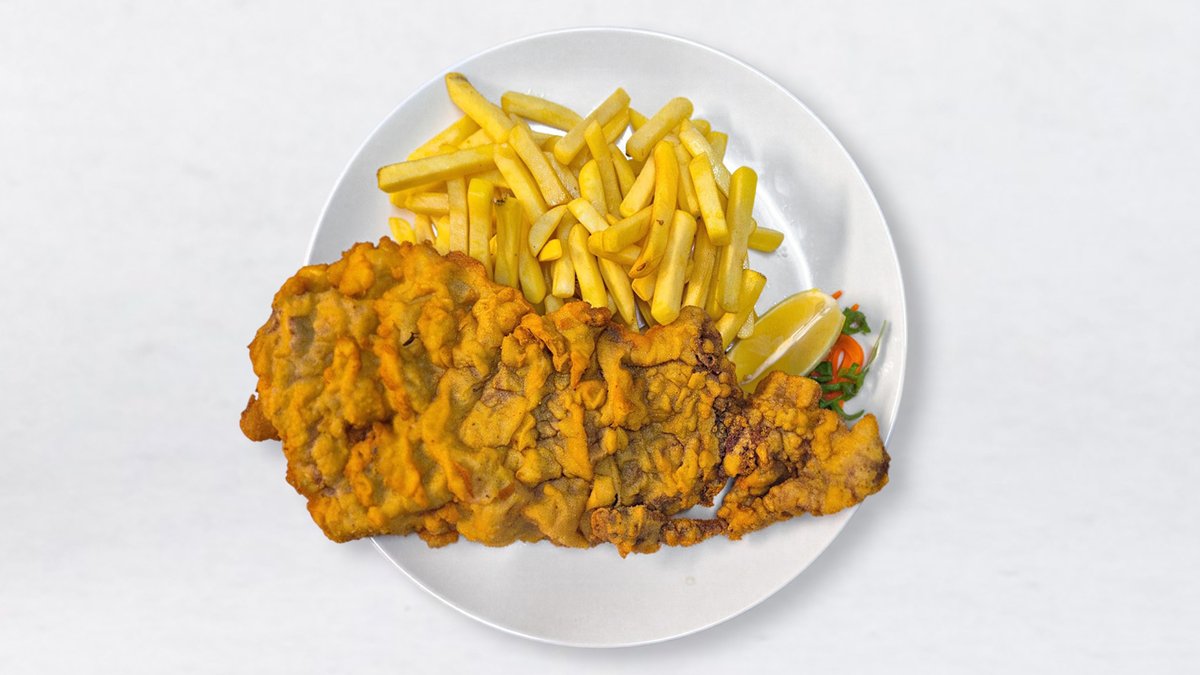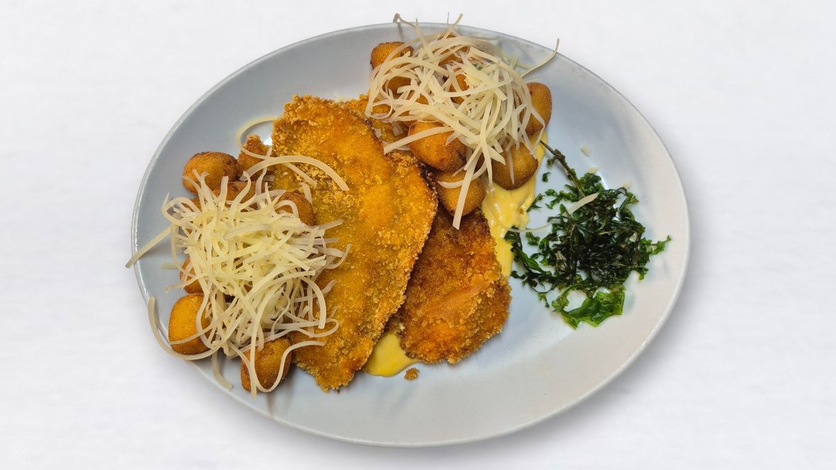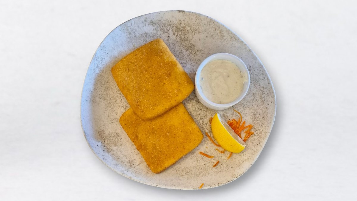 Polnjeni lignji po dunajsko s tatarsko omako in pomfrijem
