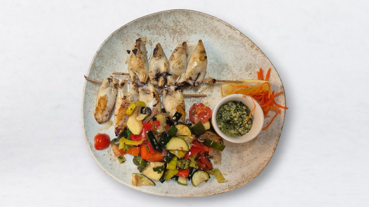 Lignji na žaru s tržaško omako in zelenjavo z žara