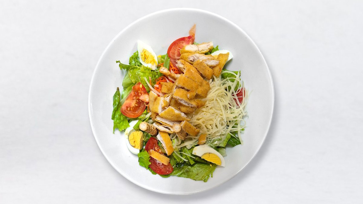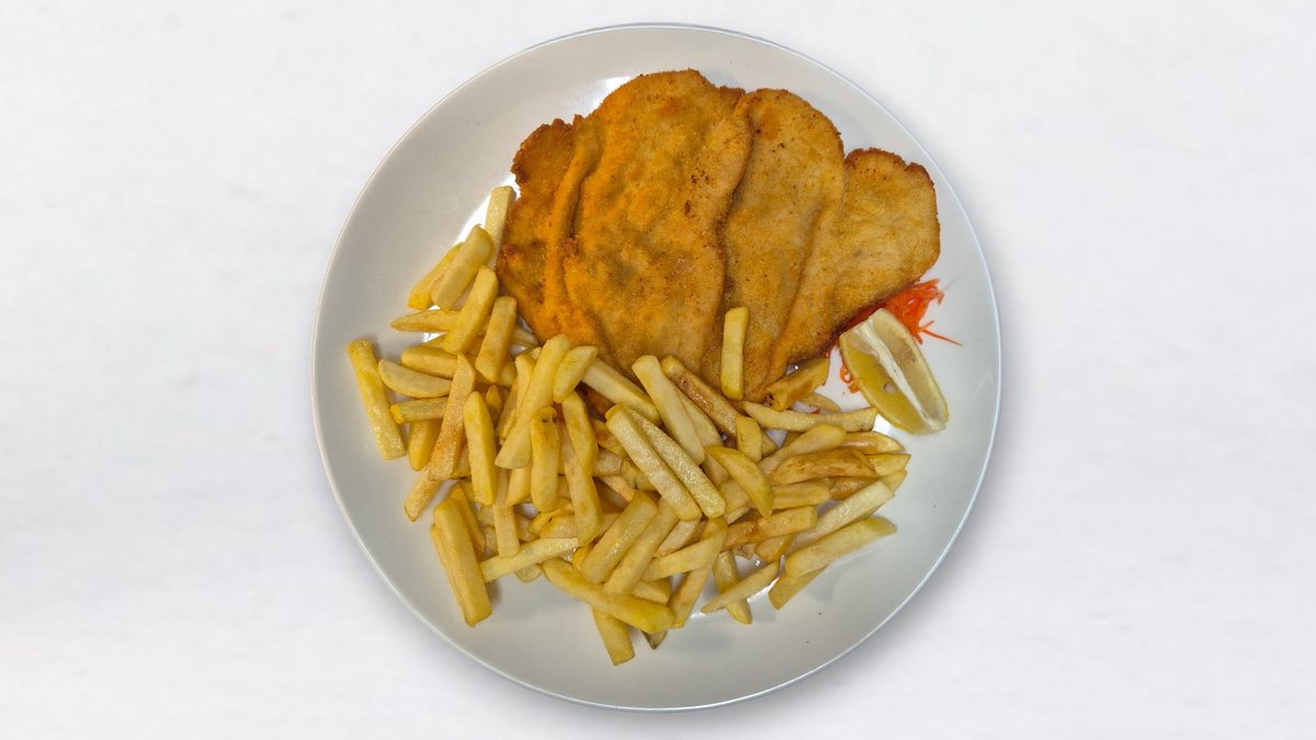 Piščančji file na žaru ali po dunajsko, zelena solata, korenje, paradižnik, kuhano jajce, parmezan, jajčni preliv, grisin V ceno jedi je všteto doplačilo 0.50 eur za biorazgradljivo embalažo