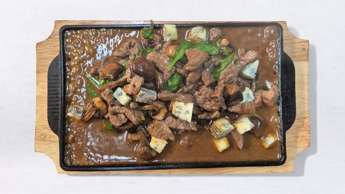 Goveji trakci s šampinjoni, špinačo in gorgonzolo, gratiniran krompir