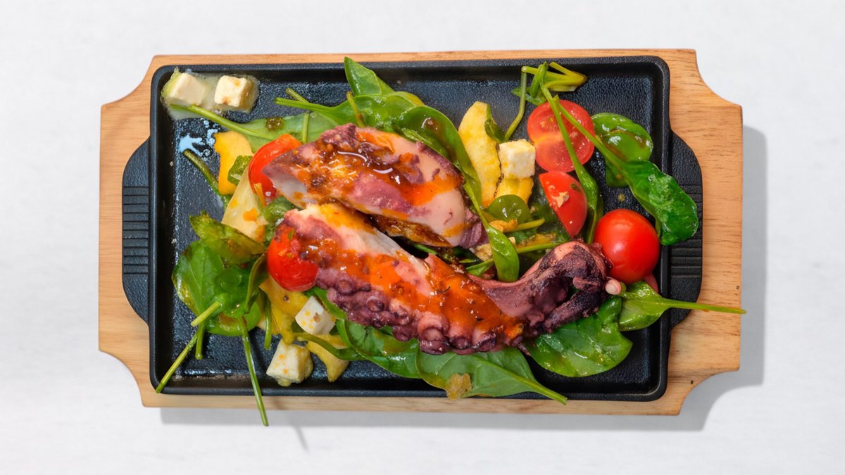 Vijolična hobotnica, polenta, špinača s feto, češnjev paradižnik