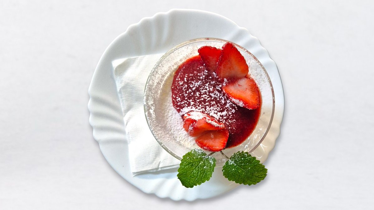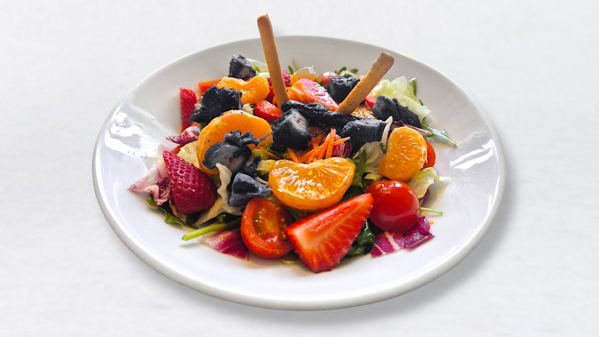 Solatni krožnik z vijolično hobotnico, mandarino in jagodami, z limoninim prelivom