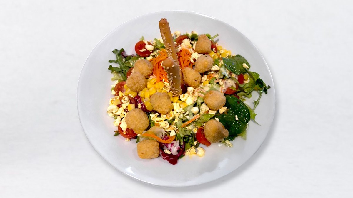 Listnata solata, koruza, korenje, češnjev paradižnik, ocvrte piščančje kroglice, kokice, cesarjev preliv V ceno jedi je všteto doplačilo 0.50 eur za biorazgradljivo embalažo