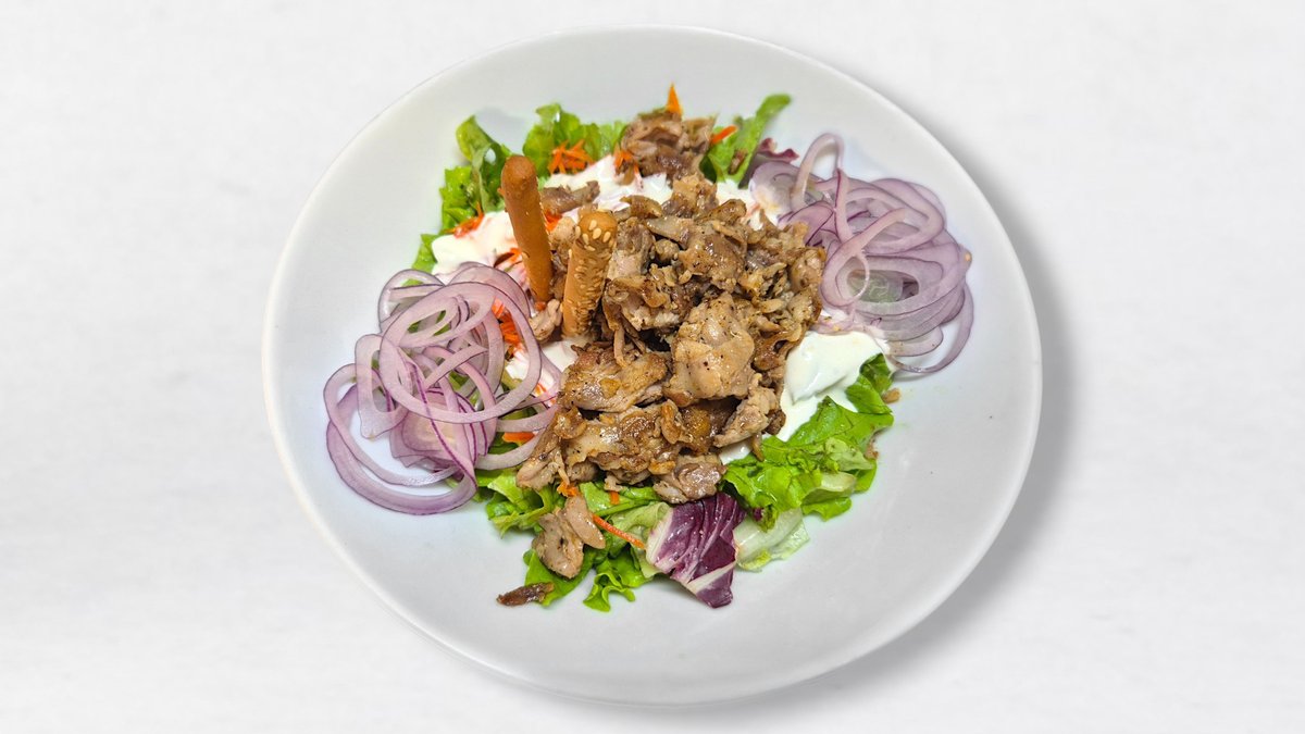Zelena solata, radič, rdeča čebula, piščanji kebab, korenje, jogurtov preliv, grisin V ceno jedi je všteto doplačilo 0.50 eur za biorazgradljivo embalažo
