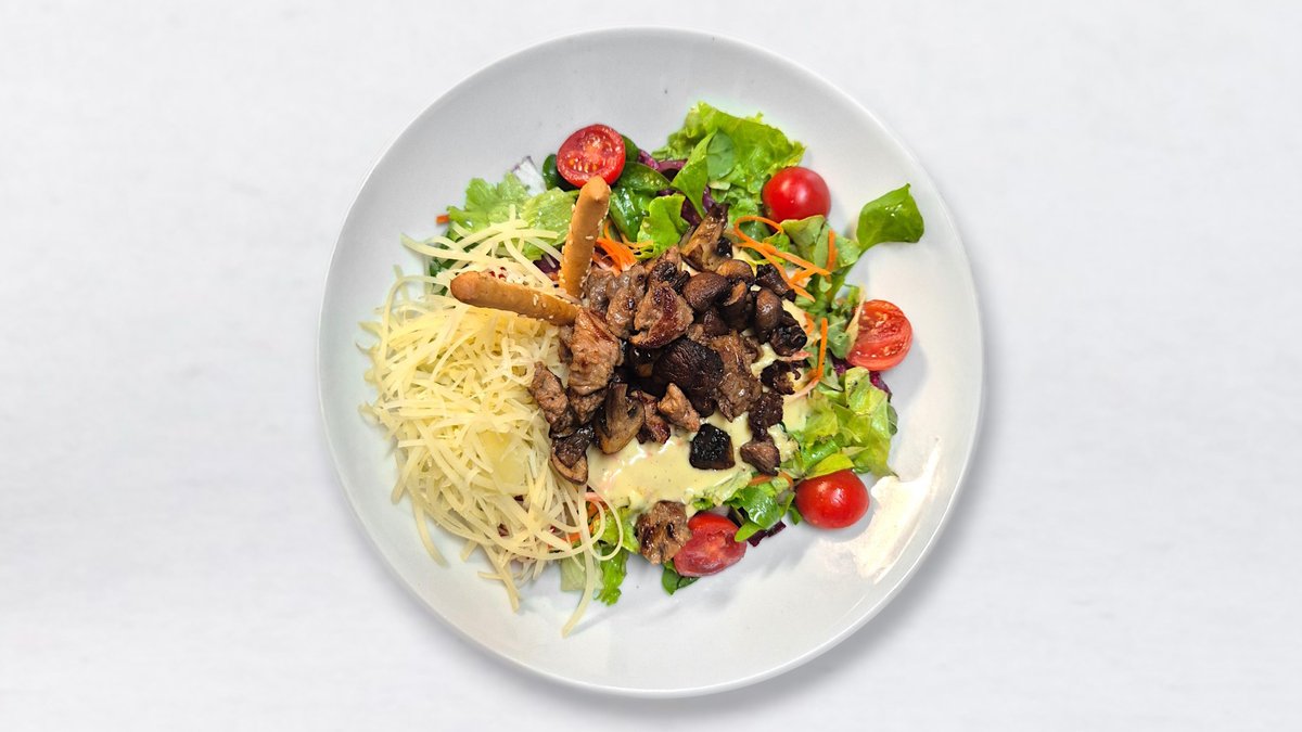 Listnata solata, korenje, češnjevec, rezine biftka, šampinjoni, gorčični preliv, čilijevi laski V ceno jedi je všteto doplačilo 0.50 eur za biorazgradljivo embalažo