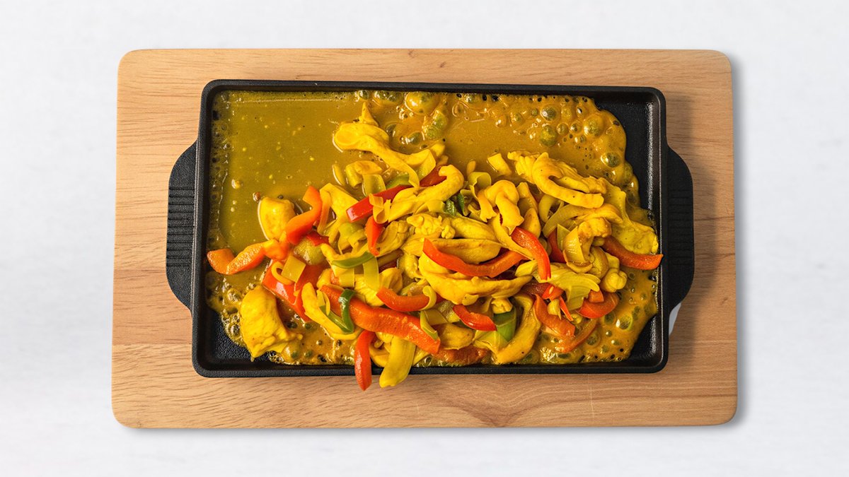 Piščančji trakci s poprom, papriko, arašidi in curry-jem, gratiniran krompir