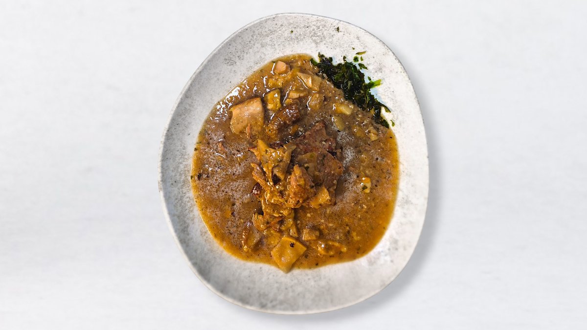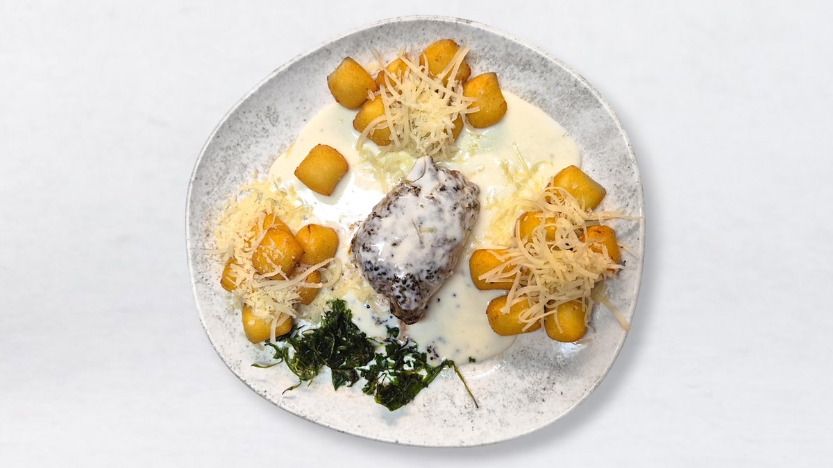 Biftek v poprovi skorjici, smetanova omaka, ocvrti njoki