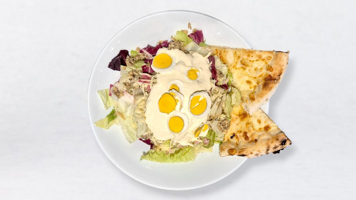 Pelati, mozzarella, slanina, radič, suha salama, kuhano jajce, oliva V ceno jedi je všteto doplačilo 0.50 eur za biorazgradljivo embalažo